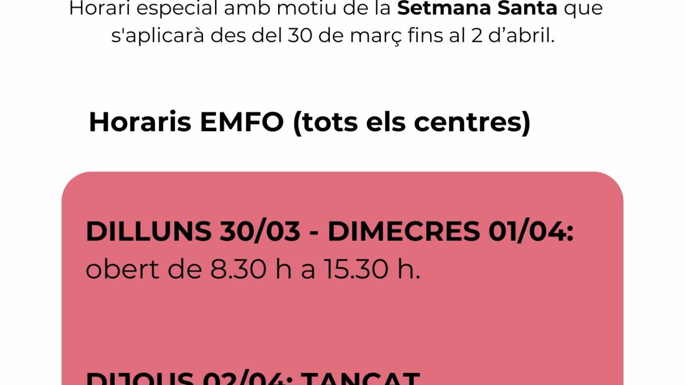 Horaris especials a tots els centres d’EMFO: De dilluns 30/03 a dimecres 01/04, a tots els centres d’EMFO es farà