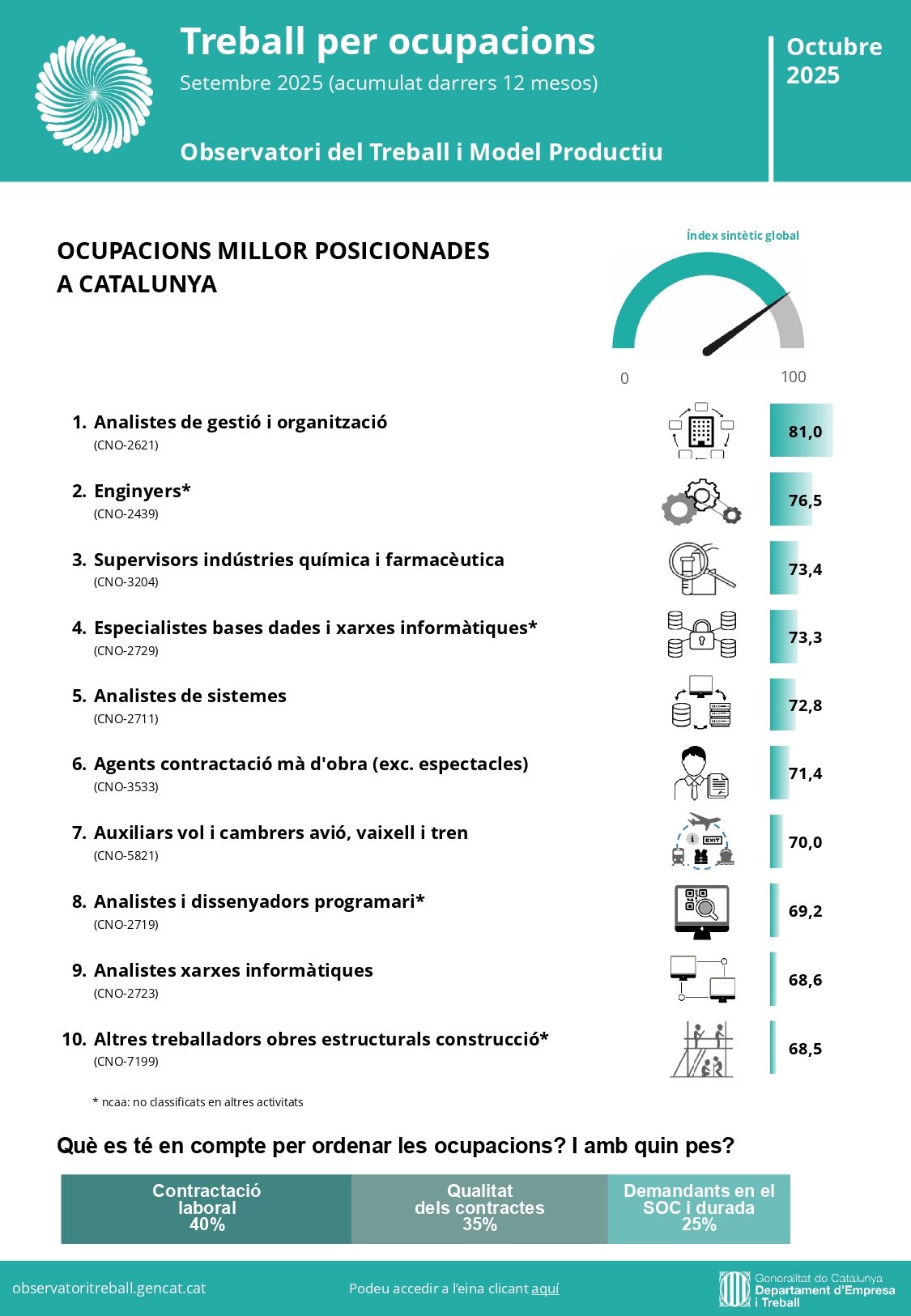 Les ocupacions millor posicionades a setembre de 2025 són els analistes de gestió i organització, els enginyers i els supervisors d’indústries química i farmacèutica. Amplia la informació aquí.